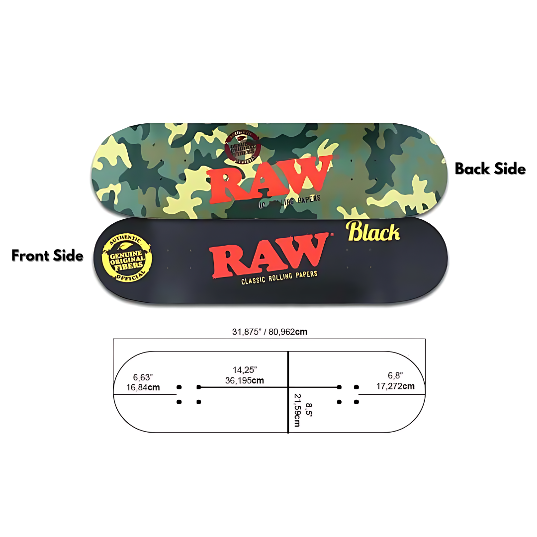 The RAW Black and Camouflage skateboard deck boasts a unique double-sided design, with one side featuring a sleek black finish and the other a bold camouflage pattern. This interesting combination attracts attention and gives your board a distinct personality. With precise details and high-quality finishing, this deck is truly a work of art for skateboard enthusiasts. Standing out with its contrasting design, this deck measures 81cm in length, 21.5cm in width, and 10mm in thickness.