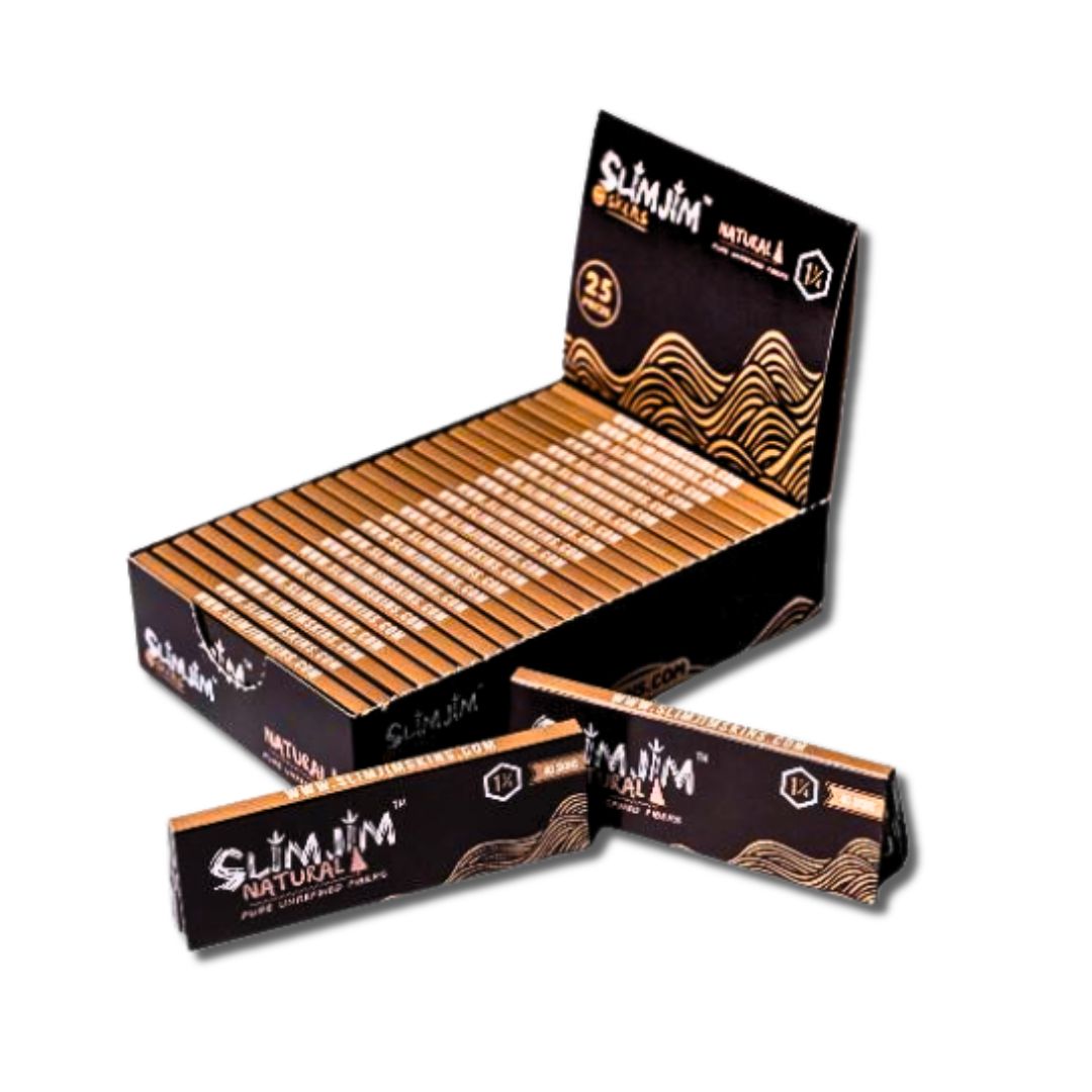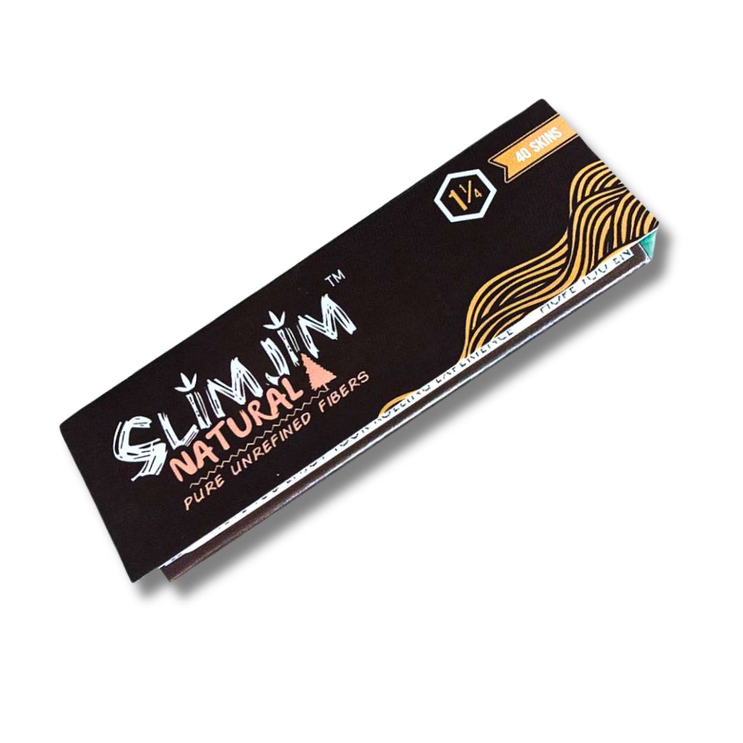 Introducing Slimjim Brown 1 1/4 Rolling Papers - crafted from pure, unbleached fiber for a natural, clean smoke. Each pack includes 40 papers, ideal for custom tobacco rolls. The use of organic hemp gum ensures a reliable seal, enhancing the overall quality. Upgrade your smoking experience now!